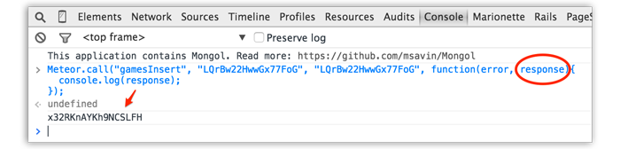 If you are wondering why it says undefined in the browser console even though our method returns gameId, it's because the gameId is passed to the callback as a parameter. The undefined is returned by Meteor.call(). To see this more clearly we can do the same as above but passing a callback: